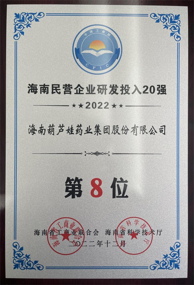 12月23日,2022海南民营企业50强和研发投入20强发布会在海口举行。会上发布了“2022海南民营企业50强”“2022海南民营企业研发投入20强”榜单和分析报告。3044永利药业再次荣登两榜,在海南民营企业50强榜单中位列第25位,较去年上升8位,这也是公司连续三年登榜;在海南民营企业研发投入20强中位列第8位,较去年上升7位。
